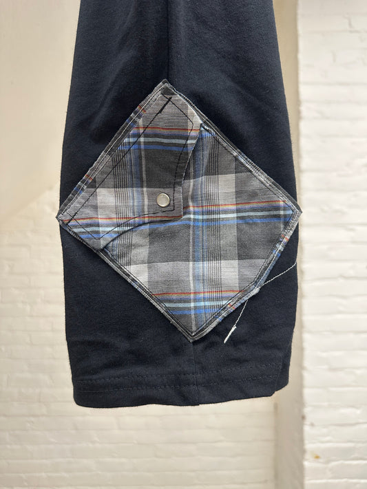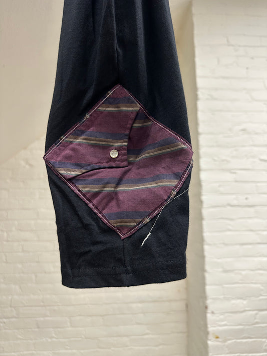 the apparel pieces themselves are aimed at being crisply and consistently branded with the full line, while simultaneously being one-of-a-kind. this is most often accomplished by integrating different sub-assemblies into each piece, which are upcycled fabrics and materials from other end-of-life products (many times these are pearl snap shirts).