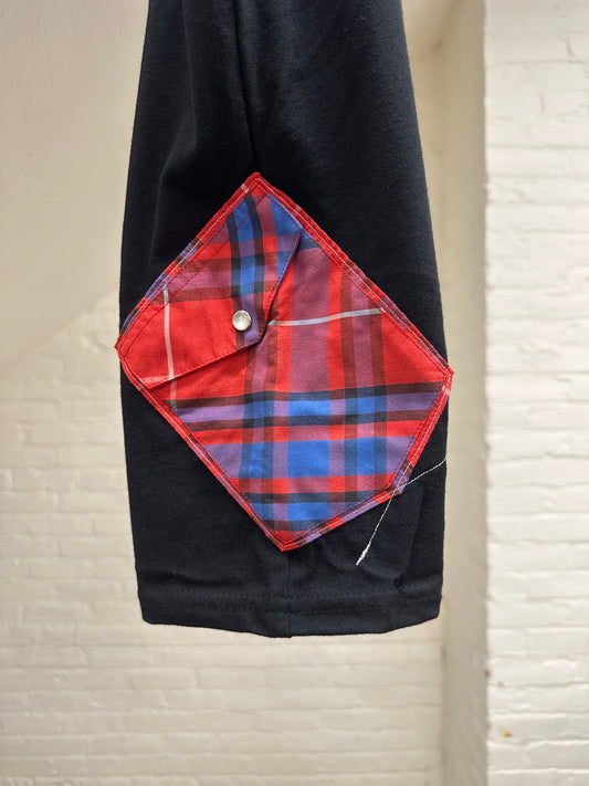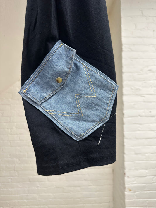 the apparel pieces themselves are aimed at being crisply and consistently branded with the full line, while simultaneously being one-of-a-kind. this is most often accomplished by integrating different sub-assemblies into each piece, which are upcycled fabrics and materials from other end-of-life products (many times these are pearl snap shirts).