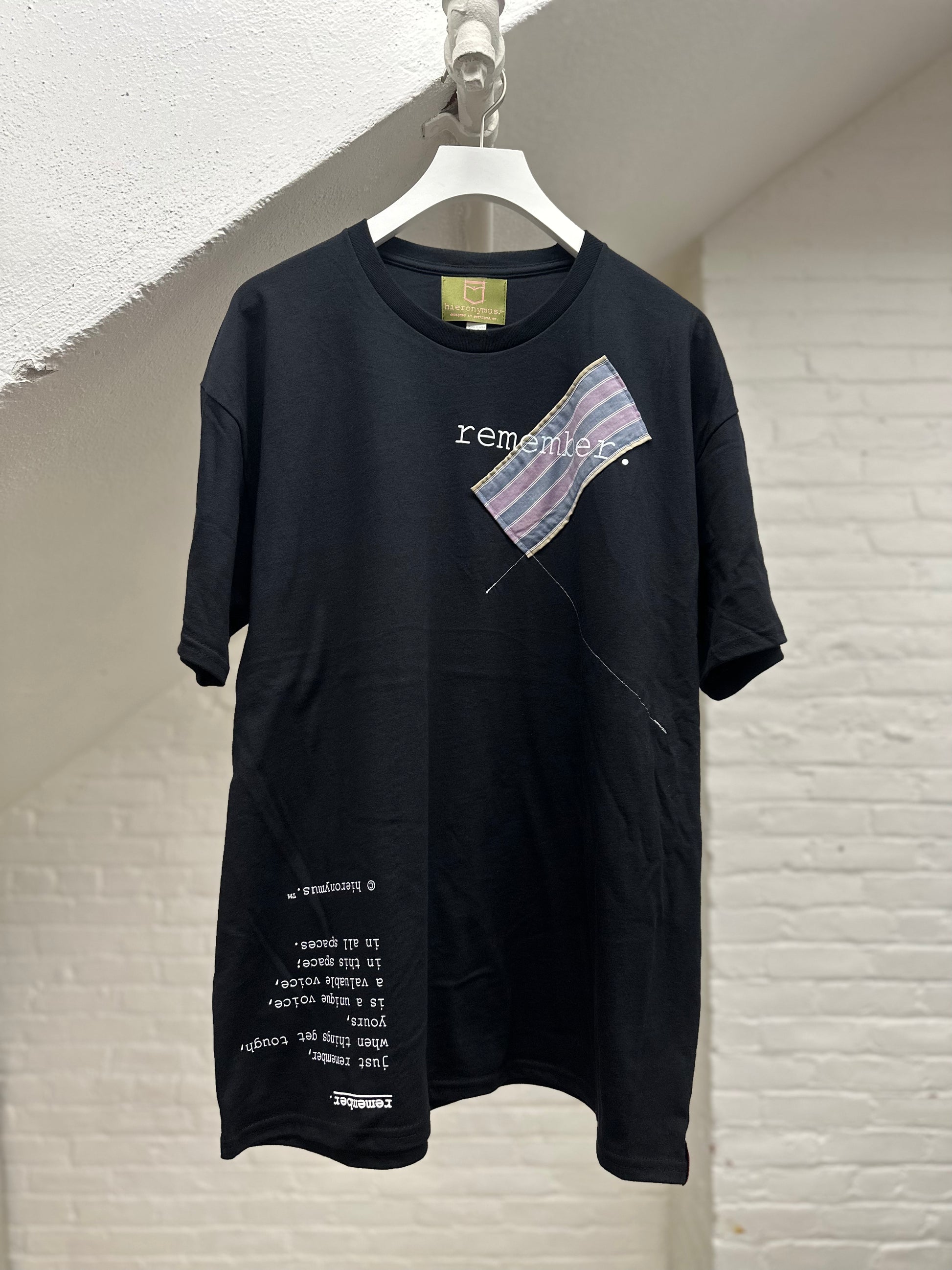 each "remember." piece comes with its own unique upcycled and numbered fabric swatch stitched to the left chest (this is swatch ps15). there is only one of each color swatch, so have fun shopping for the one you love most!
