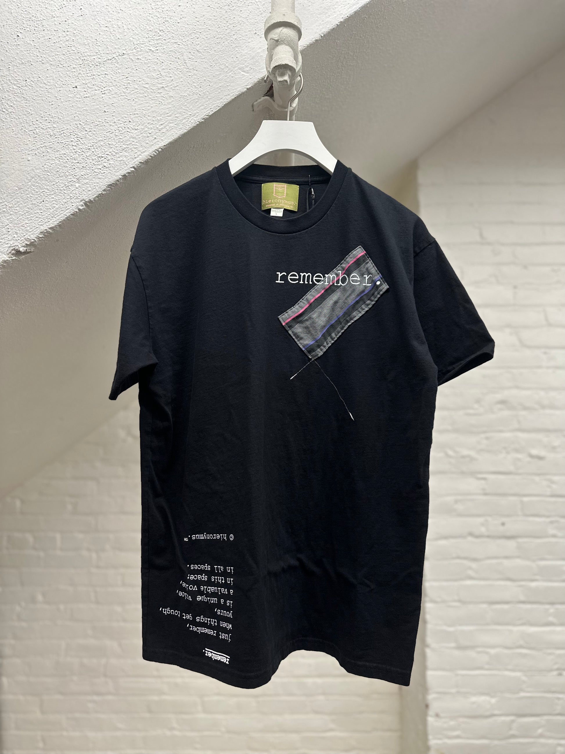 each "remember." piece comes with its own unique upcycled and numbered fabric swatch stitched to the left chest (this is swatch ps2). there is only one of each color swatch, so have fun shopping for the one you love most!