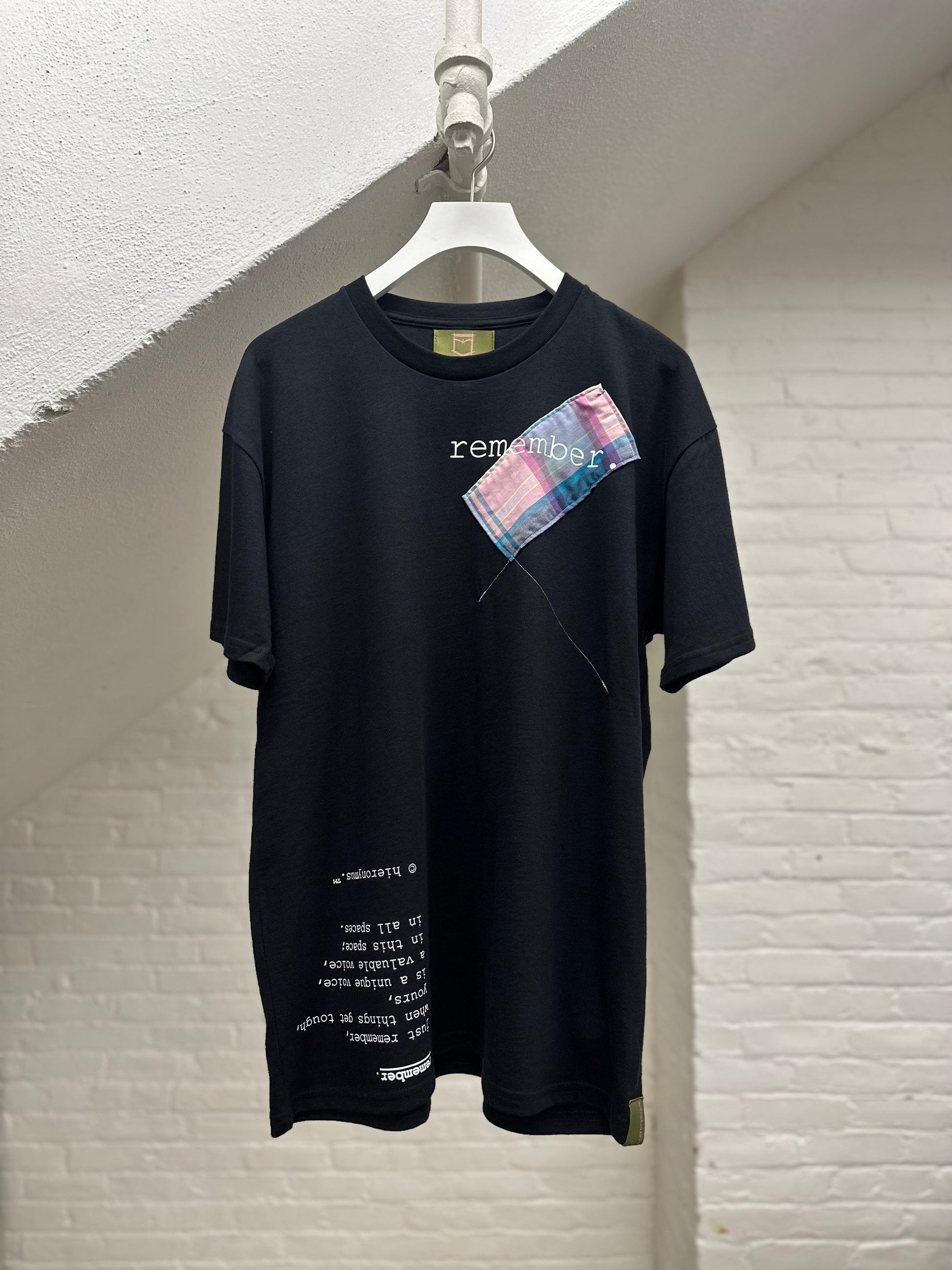 each "remember." piece comes with its own unique upcycled and numbered fabric swatch stitched to the left chest (this is swatch ps3). there is only one of each color swatch, so have fun shopping for the one you love most!