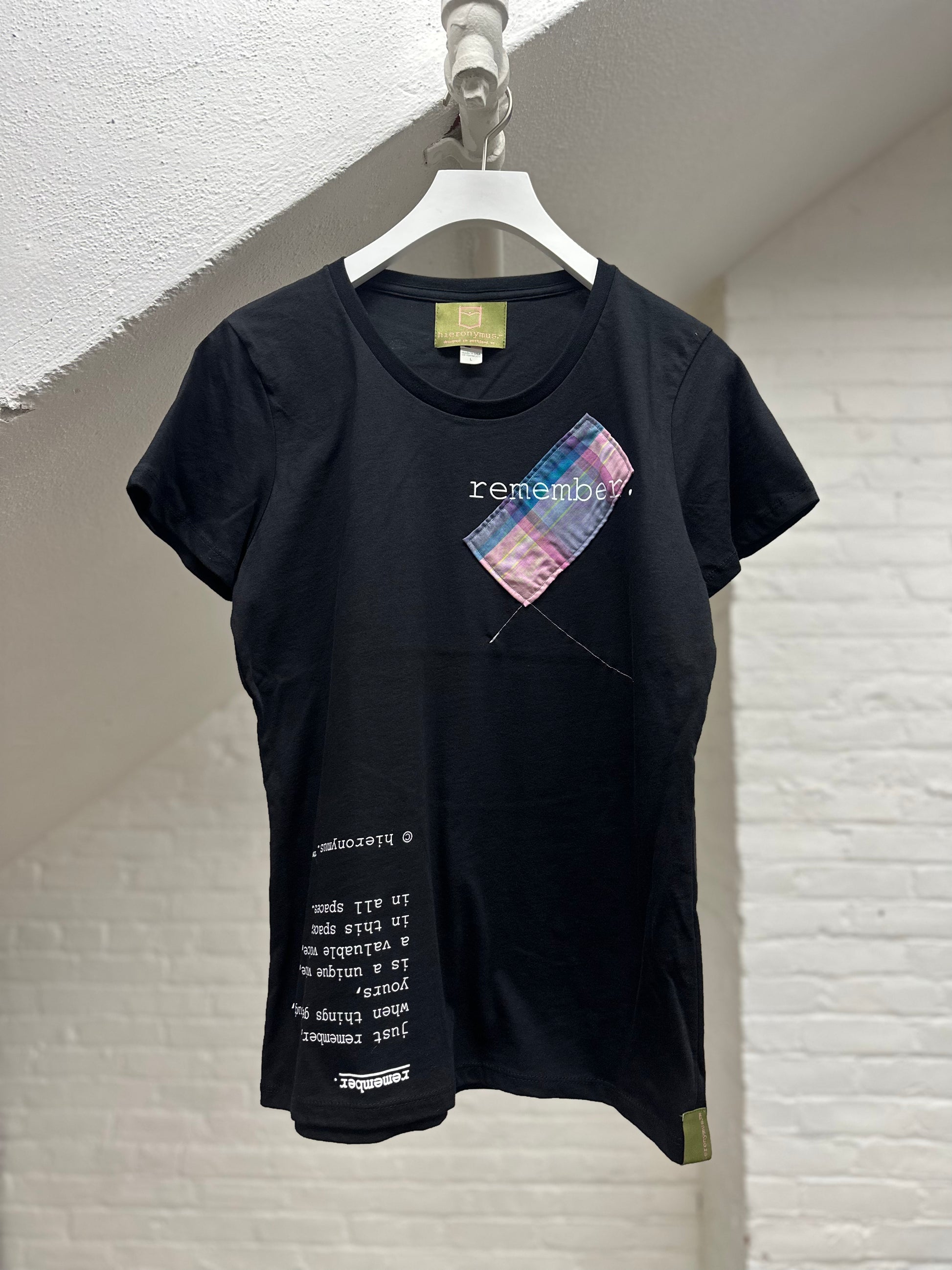 each "remember." piece comes with its own unique upcycled and numbered fabric swatch stitched to the left chest (this is swatch ps3). there is only one of each color swatch, so have fun shopping for the one you love most!