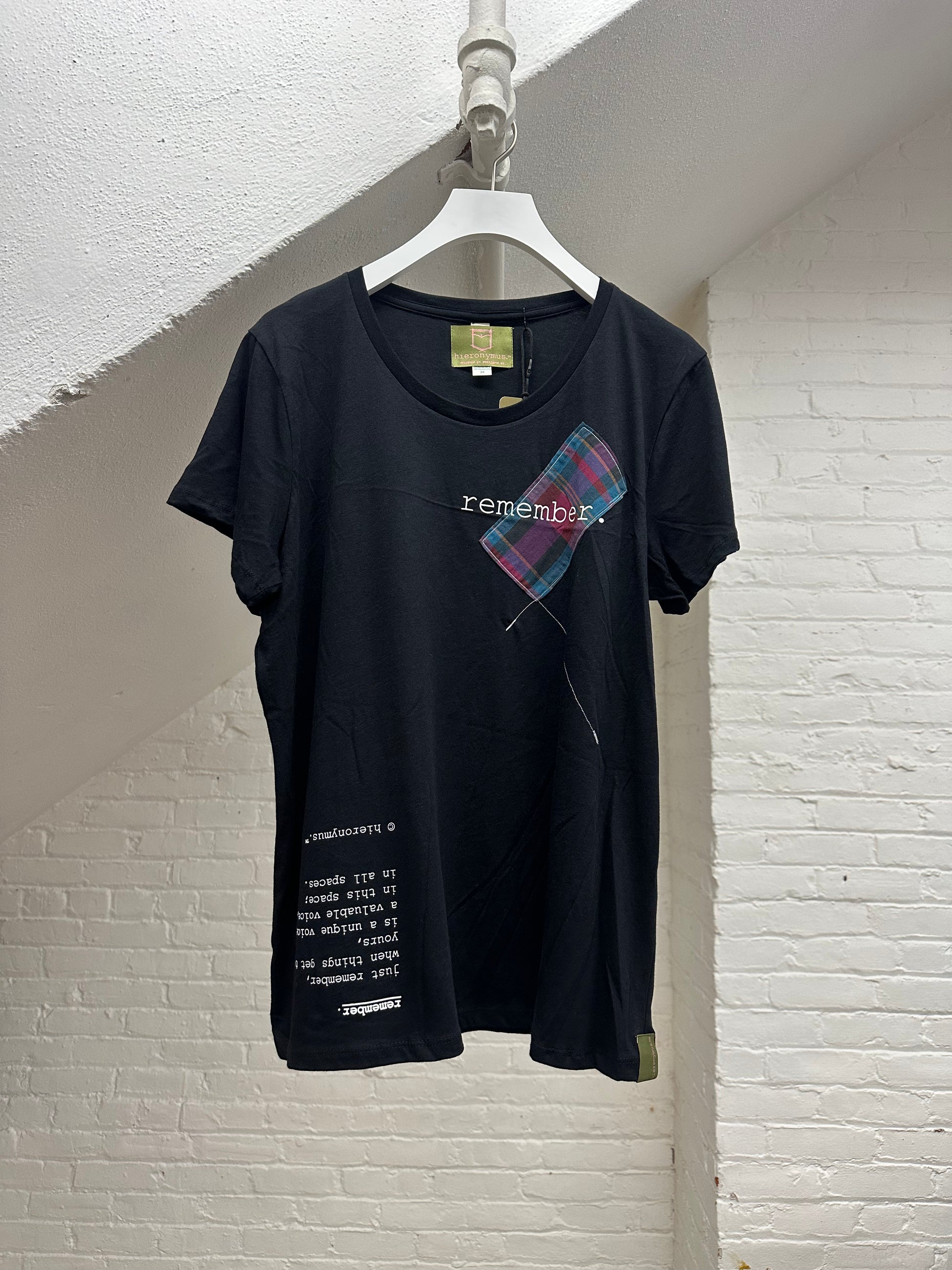 each "remember." piece comes with its own unique upcycled and numbered fabric swatch stitched to the left chest, so have fun shopping for the one you love most!