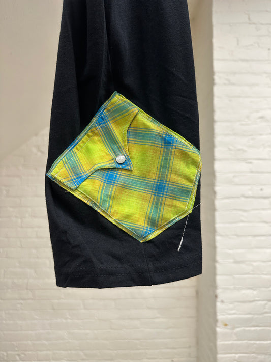 the apparel pieces themselves are aimed at being crisply and consistently branded with the full line, while simultaneously being one-of-a-kind. this is most often accomplished by integrating different sub-assemblies into each piece, which are upcycled fabrics and materials from other end-of-life products (many times these are pearl snap shirts).